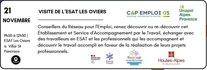 Conseillers du Réseau pour l’Emploi, venez découvrir ou re-découvrir cet Établissement et Service d’Accompagnement par le Travail, échanger avec des travailleurs en ESAT et les professionnels qui les accompagnent et découvrir le travail accompli en faveur de la réalisation de leurs projets professionnels.
