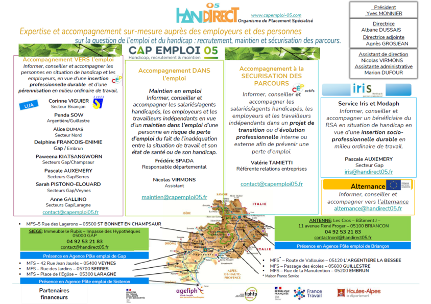 Présent dans les Hautes-Alpes depuis 1995, à l’initiative de l’Union Pour l’Entreprise du 05, HANDIRECT 05 a pour mission de contribuer à l’emploi des personnes handicapées en accompagnant celles-ci dans leur parcours professionnel et en soutenant les entreprises dans leur recrutement, leur politique de gestion des ressources humaines et de maintien dans l’emploi.